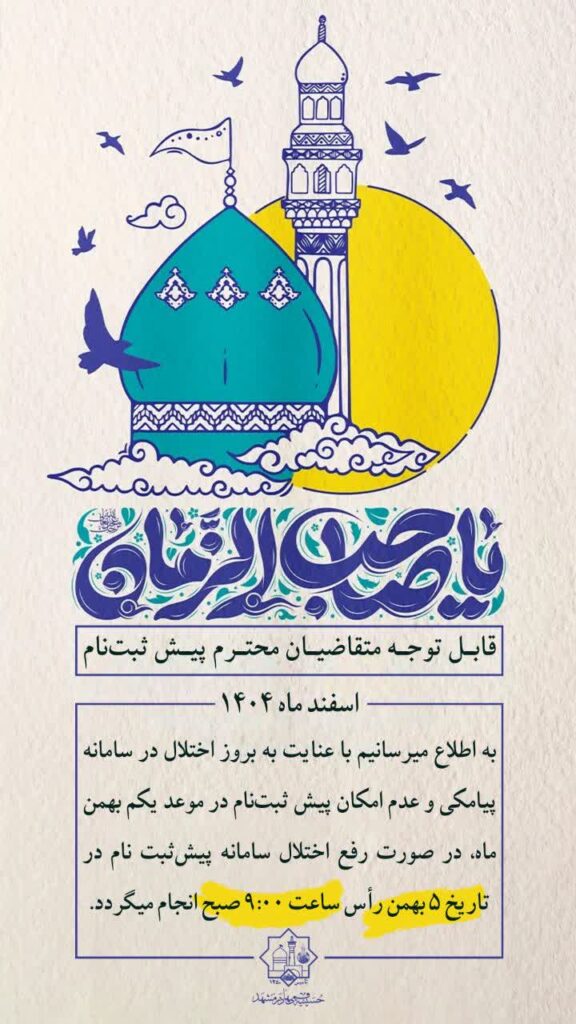 «خواهشمندیم با مطالعه دقیق این راهنما، بهویژه شرایط مربوط به کد ملی، زمان ثبتنام، ظرفیت، مدت اقامت و عدم پذیرش مجردی، در انتخاب و نهاییسازی رزرو دقت فرمایید تا فرصت بهرهمندی از این تسهیلات برای همه زائران گرامی فراهم باشد.»